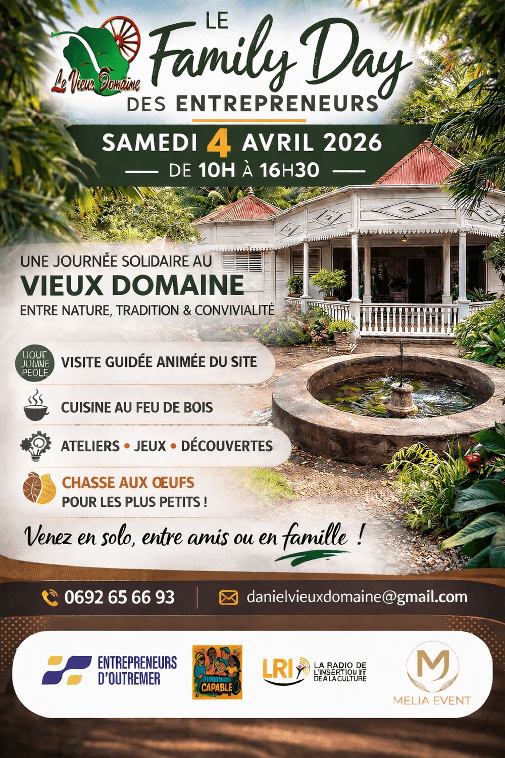| 🌿 LE FAMILY DAY DES ENTREPRENEURS – ÎLE DE LA RÉUNION 🌿 Tu es entrepreneur à La Réunion et tu aimerais vivre une journée conviviale mêlant réseau, famille, détente et patrimoine ? Le Family Day des Entrepreneurs est fait pour toi !Samedi 4 avril 2026De 10h à 16h30📍 Le Vieux Domaine – Saint-Pierre Une journée solidaire et conviviale dans un cadre naturel et patrimonial exceptionnel. Au programme :* Visite guidée animée du site* Cuisine traditionnelle au feu de bois 🔥* Ateliers & démonstrations artisanales* Jeux, dominos, cartes, pétanque* Chasse aux œufs de Pâques 🐰 pour les enfants* Moments de partage entre entrepreneurs et familles Objectif de la journée :❤️ Soutenir l’association “Jardin Bourbon et des Traditions”, qui œuvre depuis plus de 30 ans à la préservation du Vieux Domaine, joyau du patrimoine réunionnais. Venez seul, entre amis ou en famille ! 🎟️Tarifs :* Adultes et +12 ans : 30€ (accès, visite, repas, animation, tout compris)* Enfants 6–12 ans : 16€ (accès, visite, repas, animation, tout compris)* Enfants 0–5 ans : Entrée gratuite (repas non inclus) Événement organisé par :Entrepreneurs d’outremer • Melia Event • Outrement Capable • LRI- La Radio de l’Insertion et de La Culture Une journée de cœur pour entreprendre autrement, en famille. NB : journée solidaire, l’ensemble des fonds récoltés seront versés à l’association Jardin Bourbon et Traditions. N’hésite pas à en parler autour de toi !Je participe au Family Day ![]() |